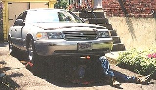 Here's a shot of my brother under the Vic when we gave it it's first oil change. We put in 5W30 Mobil 1 synthetic, with a Mobil 1 filter. I got my first good look at the underside of the car, and things seem to have changed since 1988! My brand new pitman arm was right under the filter, so I recommend if doing this on ramps, try and turn the wheels if you can to one side, to help you reach the filter better, and cover the rubber bushings with plastic. The oil will drip all over the place!