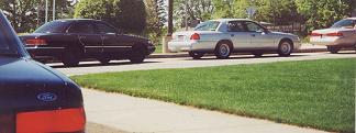 As usual, everyone looked over the cars, talked about future mods, past injuries, and kept saying "why doesn't my car have that??" Our host Joe then took us on a convoy to Dairy Queen before hitting the highways for home. We ended up touring 2 or 3 mall parking lots, drawing many interesting looks and comments as we drove. We all were saying over radios that we wish we had a video camera, or that someone could take a good photo of us all. Stuntman Jim came to the rescue again, as you can see to the right. And yes, we stopped at red lights...